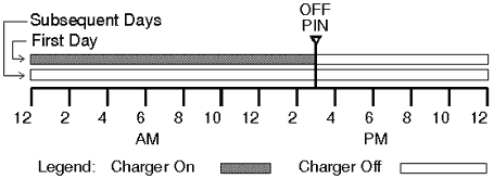Now that we know what the standard charger is, how do we use it? Most important, follow the manufacturer’s instructions. A typical manufacturer recommends a 15 hour charge to fully charge a discharged battery. If your battery is only partially discharged, your can prorate the charge time. For instance, a battery that is one third discharged will fully charge in only 5 hours. If you don’t know the condition of your battery, then you should charge it for the full 15 hours. What happens if you forget to disconnect the charger and end up charging for more than the required amount? If you overcharge by only a few hours, don’t worry. If you leave your charger connected for a couple of days, then you’re unduly stressing your batteries. If you’re the forgetful or worrying type, then you might want to use a timer. I like to use the standard 24 hour security timer, used to switch lights on and off when you’re away. It is sold almost anywhere, usually less than $10 on sale. To use a timer with removable ON/OFF pins for standard charging, first rotate the time dial until 12 midnight. Now insert an OFF pin at the 3pm position (15 hours) and remove any remaining pins (figure 1). Now plug your charger into the timer and the timer into a wall socket. Rotate the on/off switch on the timer until your charger turns on, and leave it alone. After 15 hours your charger will shut off and remain so. If you have a timer without removable pins set it up as above, but instead of inserting an OFF pin at 3pm, set an ON/OFF pin (or if separate pins, the ON and OFF pins together) at 2:30pm such that the timer will turn on at 2:30pm and off at 3pm (figure 2). It will operate similar to a single cycle timer, except on subsequent days the charger will turn on for one half hour each day (actually an advantage as we’ll see later).